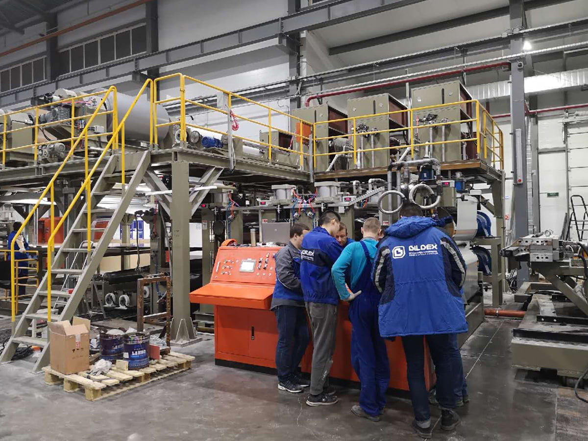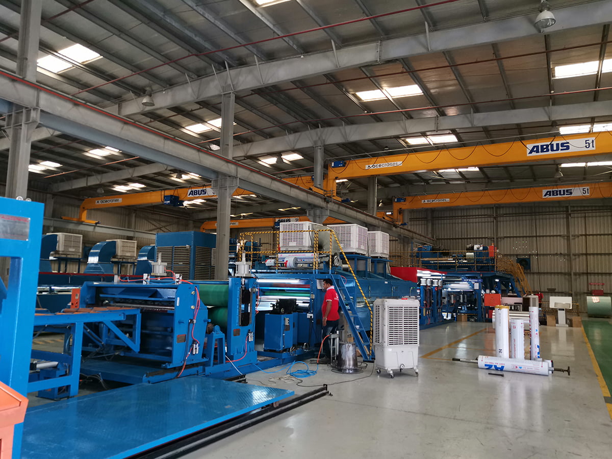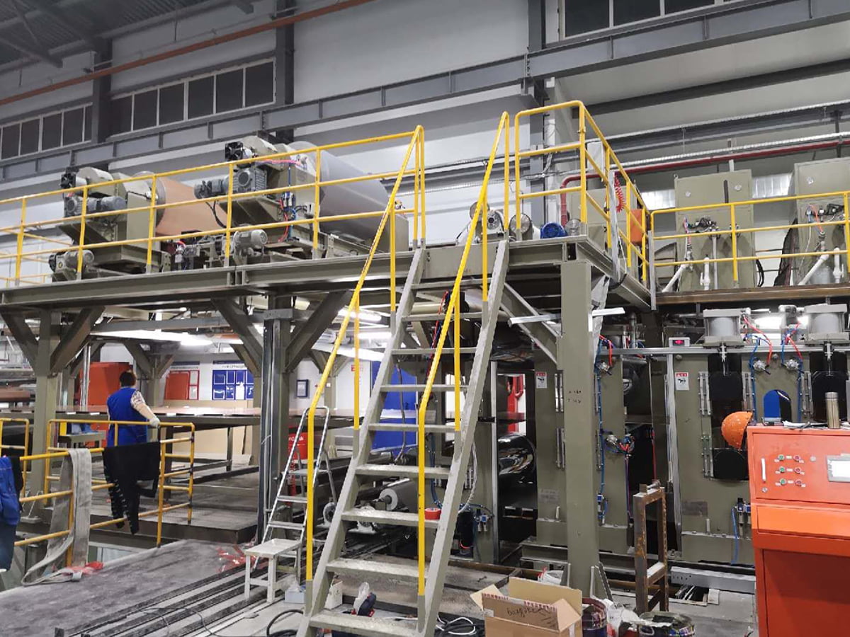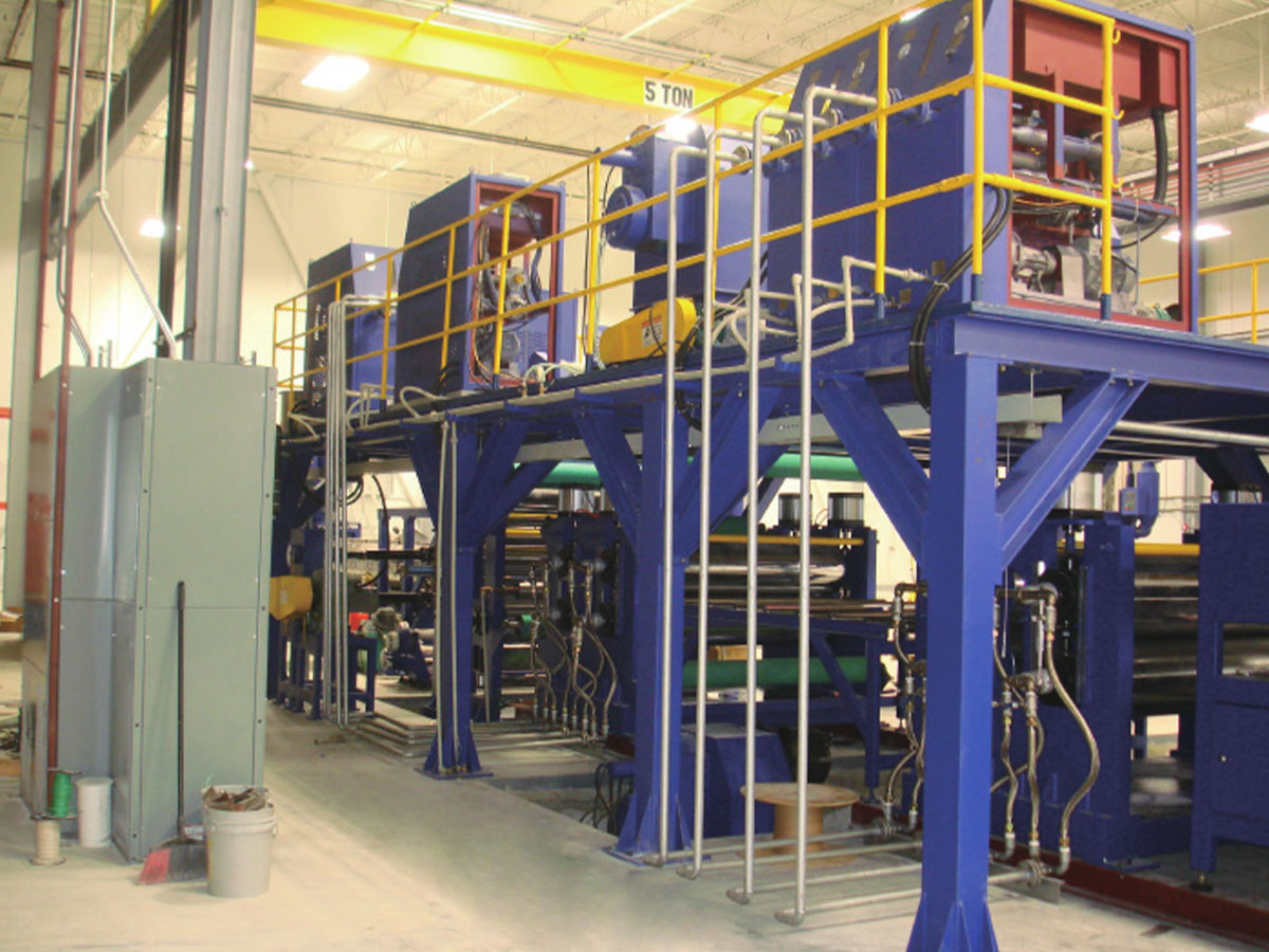 This line is for making PE/B1 class aluminum composite panel. The basic theory is to composite aluminum coil, high polymer film and core material from extruder under the pressure of high-temperature rollers, and cut it to the required length. We upgraded the 2nd, 3rd, 4th generation line referred to the advantages of the 1st generation lines from Germany, and invented 2-roller compositing, 3&2-roller two-way compositing technique. Not only improved the operation and use performance, but also regarded as the original productions in the industry.
