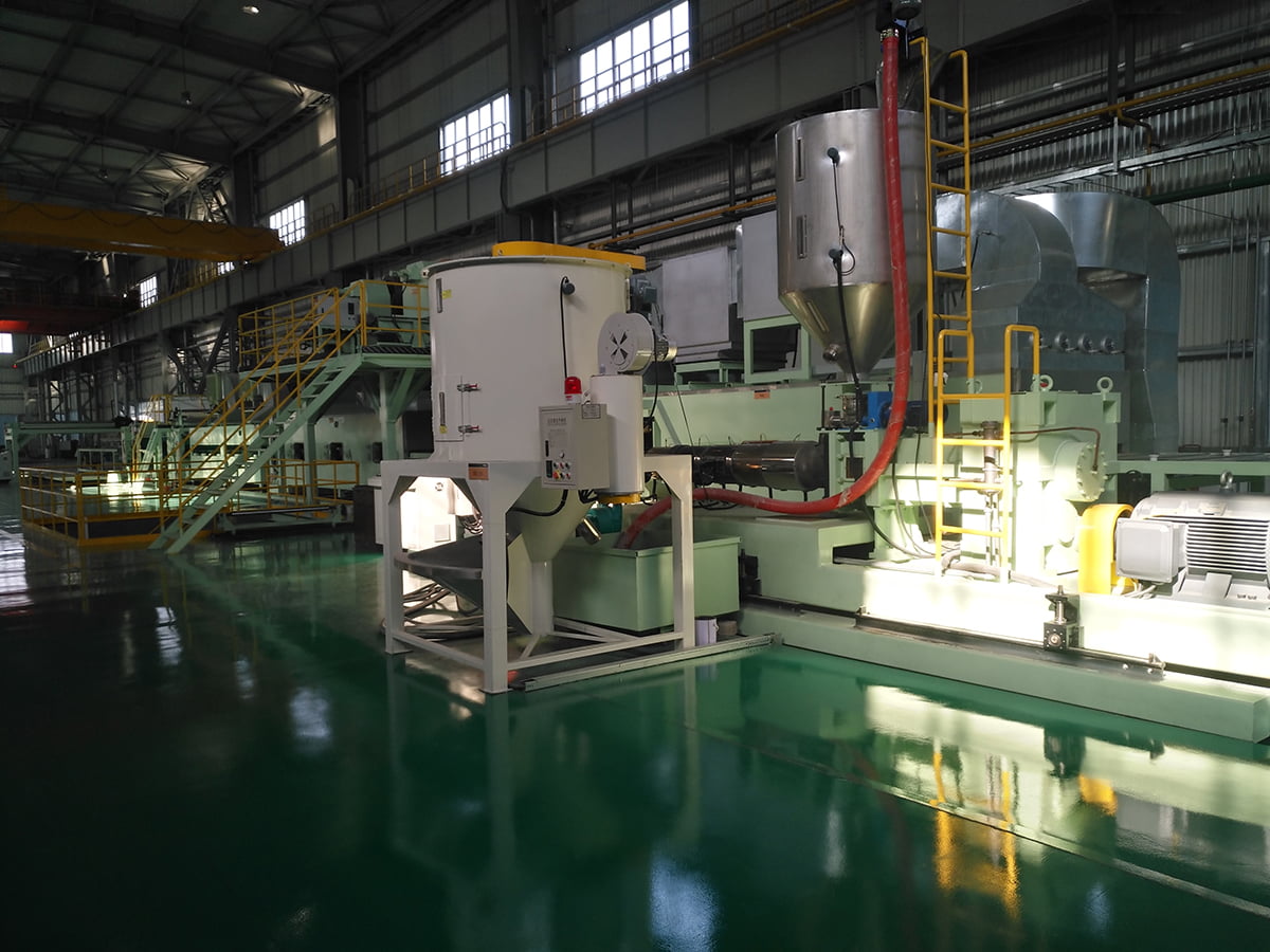 □Single screw series: 180 type ≦2m/min □Twin conical screw series: □75 type ≤3m/min □85 type ≤4m/min □95 type ≤6m/min □105 type≤10m/min Twin extruder series: use two extruders together Note: Every series has its own advantages when using different material. Speed is based on producing 3mm thickness, 1240mm width PE core plate |